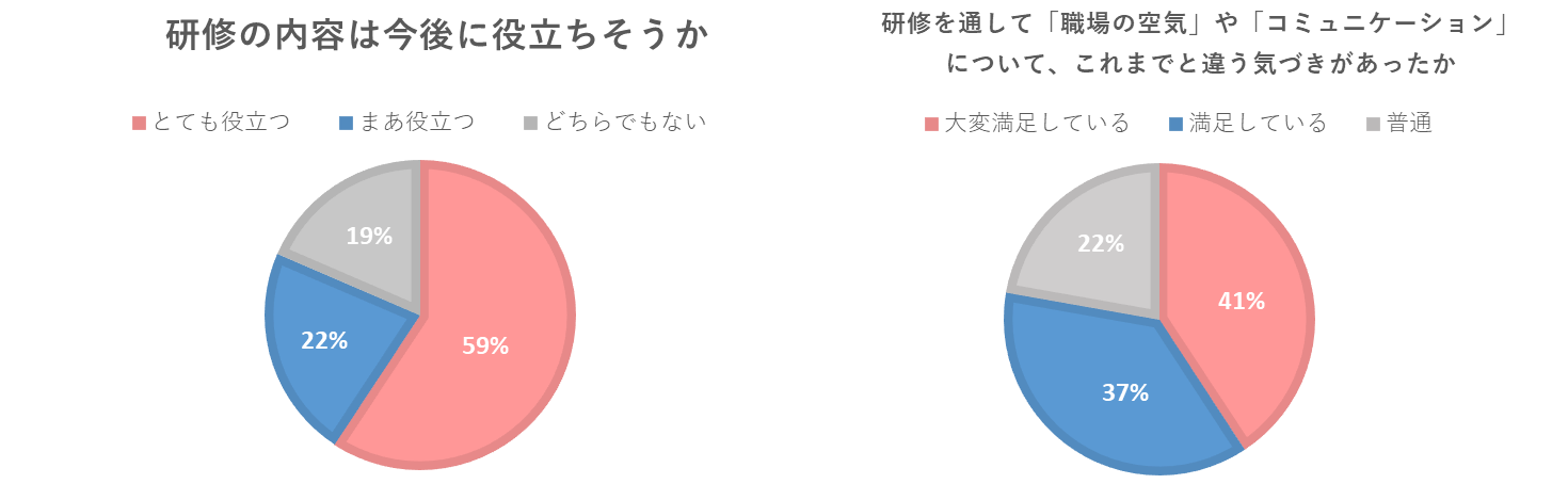 - アンケートでは、研修内容について59%が「とても役立つ」、22%が「まあ役立つ」、19%が「どちらでもない」と回答しており、また「職場の空気やコミュニケーションについて新たな気づきがあったか」という問いには、41%が大変満足、37%が満足、22%が普通と回答しています。