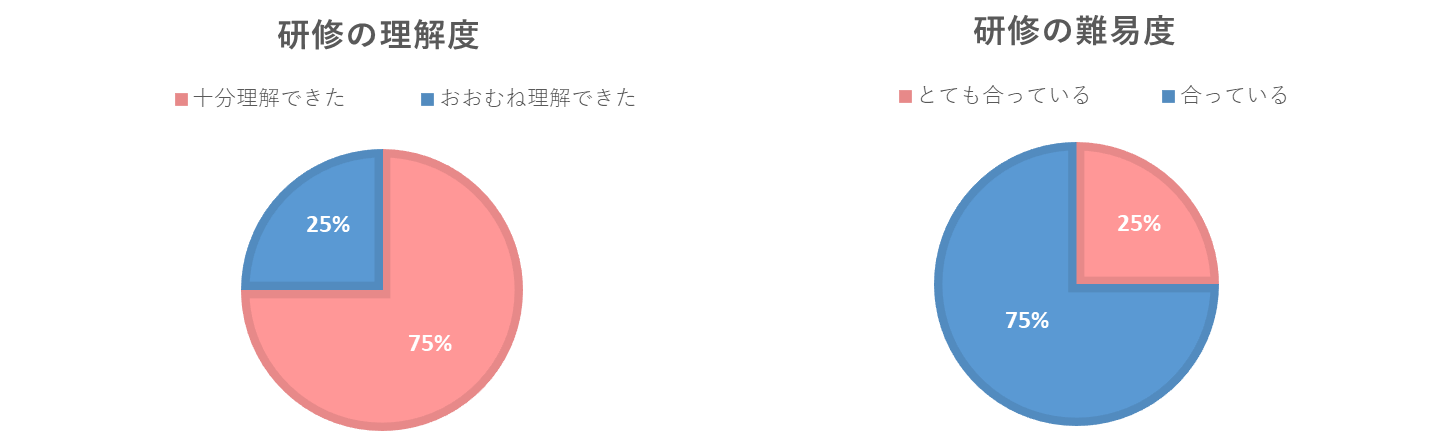 - アンケート結果からは、理解度について「十分理解できた」「おおむね理解できた」と回答した方が大半を占めており、テーマや進め方が、受講者の現在の立場や課題感に概ね合っていたことがうかがえます。また、難易度についても「合っている」と感じた方が多く、考えながら参加する研修として受け止められていました。