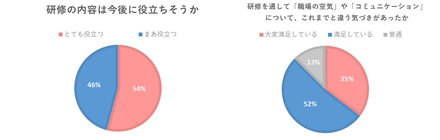 - アンケートでは、研修内容について全員が「役立つ」と回答しました。また、「職場の空気やコミュニケーションへの気づき」についても約9割が満足と回答しており、日常のマネジメントと結びつけて受け止められていたことがうかがえます。