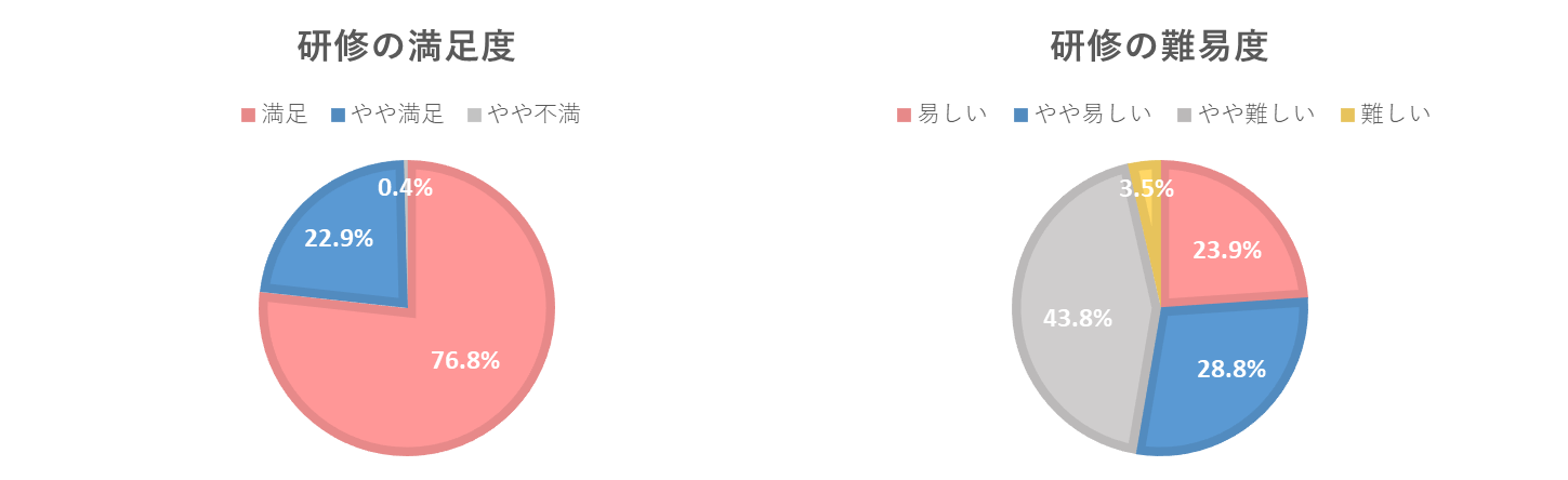 - アンケート結果では、研修の満足度について「満足」「やや満足」が100%を占め、全体として非常に高い評価が得られました。難易度についても、「やや易しい」「やや難しい」が大半を占めており、概ね適切な水準であったと考えられます。