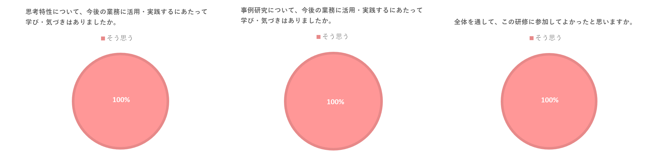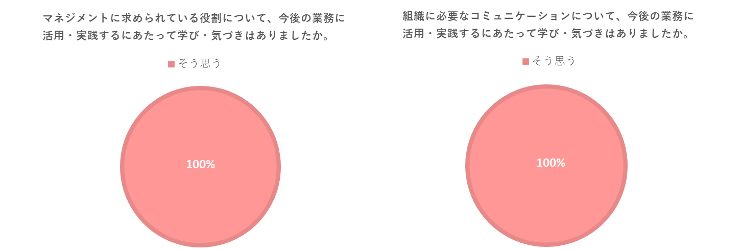 - アンケート結果では、「マネジメントに求められる役割」「組織に必要なコミュニケーション」「思考特性」「事例研究」といったすべての項目において、100%が「業務に活かせる学びがあった」と回答しており、実務への接続度の高さがうかがえる結果となりました。