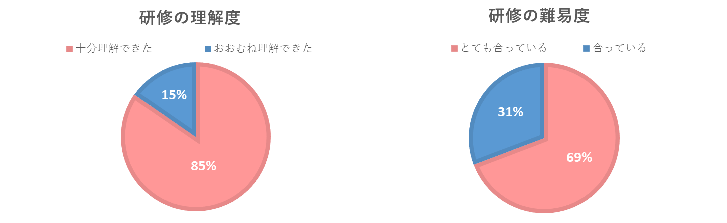 - アンケート結果からも、理解度については「十分理解できた」「おおむね理解できた」が大半を占めており、内容としても受講者にとって受け入れやすく、理解しやすいものとなっていたことがうかがえます。また、難易度についても「とても合っている」「合っている」と感じた方がほとんどであり、新卒層にとって無理なく学びを深められる設計であったと感じています。