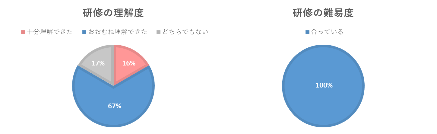 - 理解度のアンケートでは、約8割以上の受講者が「十分理解できた」「おおむね理解できた」と回答しており、難易度については全員が「合っている」と評価する結果となりました。全体として、内容のわかりやすさと実務への活用意欲が高かったことがうかがえます。
