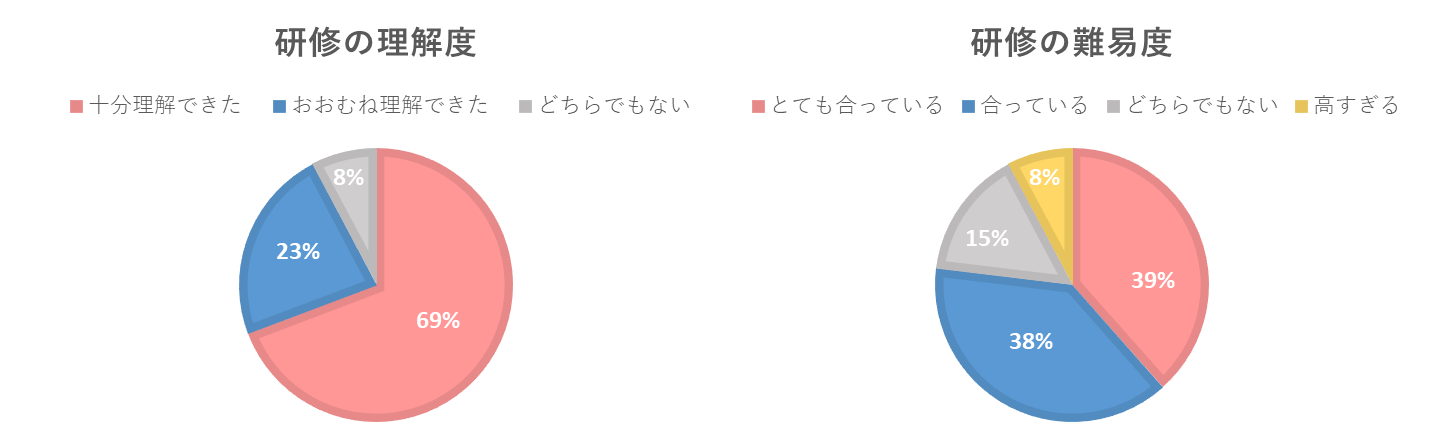 - アンケート結果からも、研修の有効性がうかがえます。理解度については「十分理解できた」「おおむね理解できた」が9割以上を占め、基礎的な内容でありながらも参加者に納得感のある構成であったことがわかります。難易度についても「とても合っている」「合っている」との回答が約8割に達し、適切なレベル感で進行できたことが確認されました。