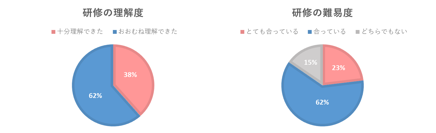 - アンケート結果を見ると、理解度については「十分理解できた」「おおむね理解できた」を合わせて100%となり、すべての受講者が研修内容をしっかりと理解できたことがわかります。難易度に関しても85%が「適切」と評価しており、現場管理者として実務に直結する水準で学びを得られたことがうかがえます。