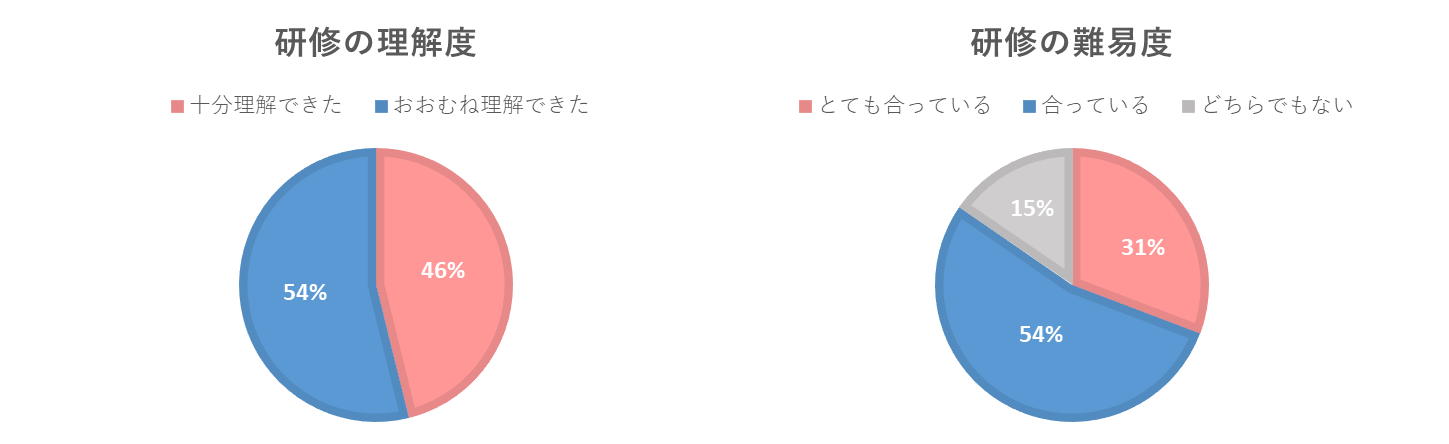 - アンケート結果では、全員が内容を理解できたと回答しており、難易度についても約8割以上が「合っている」「とても合っている」と評価されています。受講者からは、「叱ることの大切さと難しさを改めて感じた」「相手に合わせた褒め方や伝え方を意識したい」といった声が多く寄せられました。