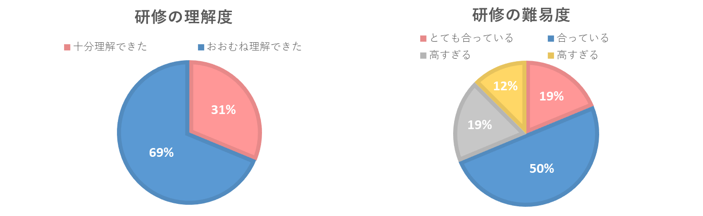 - アンケート結果からは、理解度について「十分理解できた」「おおむね理解できた」が大半を占めており、内容としてはしっかりと受講者に伝わっていたことがうかがえます。一方で難易度については、「とても合っている」「合っている」が中心でありながらも、「やや高い」と感じる声も一定数見られました。これは、単なる知識理解にとどまらず、自分自身の思考や行動を振り返る内容であったからこその結果とも言えます。