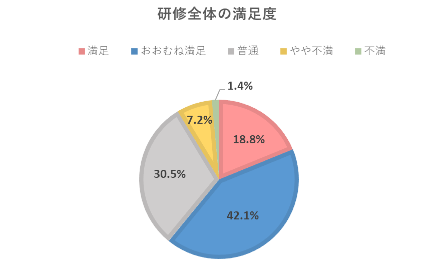 - 全体の満足度は6割程度が「満足・おおむね満足」と回答しており、研修全体を通して前向きに受け止められた様子がうかがえます。特に「段階的に学べる機会がありがたい」「他部署の考え方を共有できた」など、継続的な学びの必要性を実感する声が聞かれました。