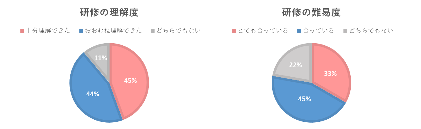 - アンケートでは、「十分理解できた」45%、「おおむね理解できた」44%と、全体の9割以上が高い理解度を示しました。難易度についても8割近くが初めて体系的にOJTを学ぶ方にも実践しやすい内容だったことがうかがえます。