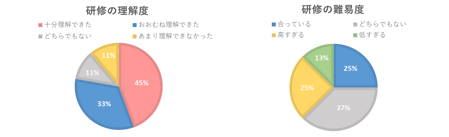 - 一方で、難易度については評価が分かれており、すぐに実践へ落とし込むには整理の時間が必要だと感じている受講者も少なくありませんでした。